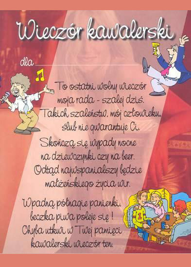 W kwestii Panów wybierajacych się na wieczór kawalerski zostaje tylko kupienie prezentu dla nowożeńca. Najczęściej są to akcesoria z sex-shopów - dmuchane lalki, cygara, kasety DVD.